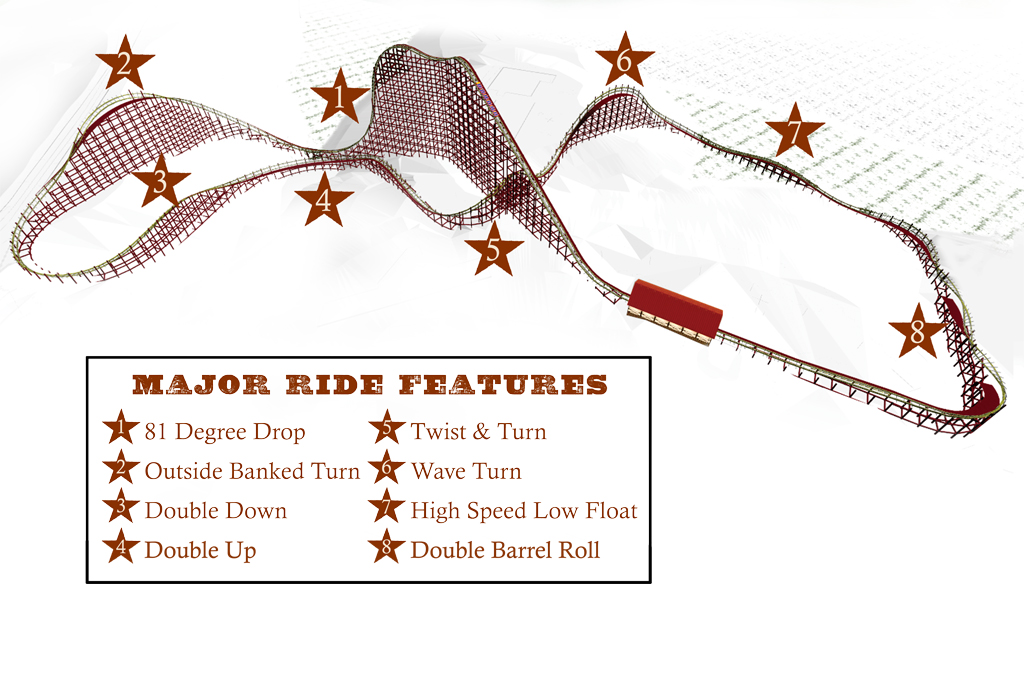 Alors que Son of Beast (auparavant le seul wooden au monde qui possédait un vertical loop puis qui a ensuite a été retiré) de Paramount Kings Dominion va fermer, Silver Dollar City reprend le flambeau d'un wooden à inversionS (avec un S, oui !) en y mettant la patate avec des figures plus originales les unes que les autres ! La photo du layout en dit plus pas vrai ? 😉
