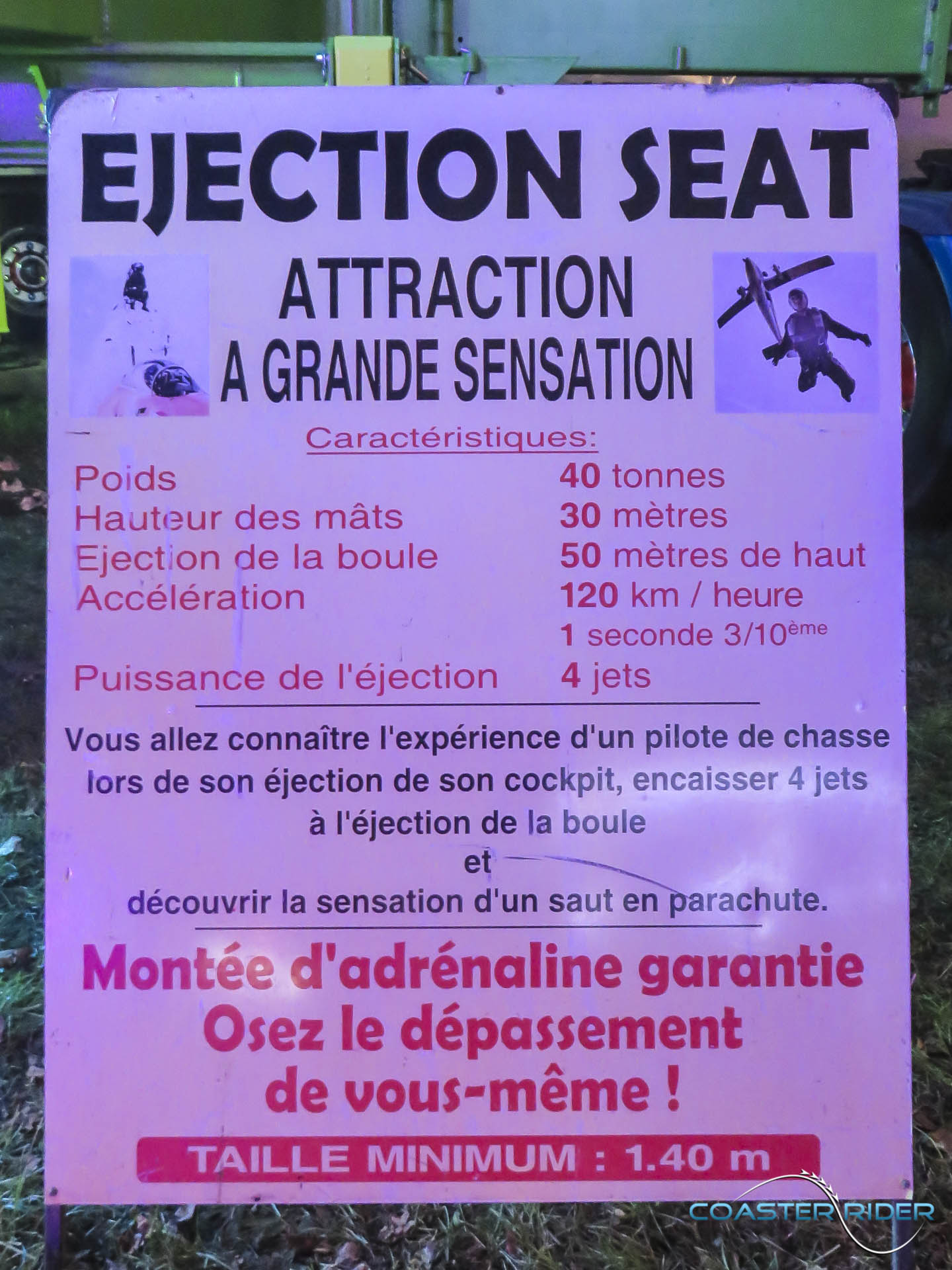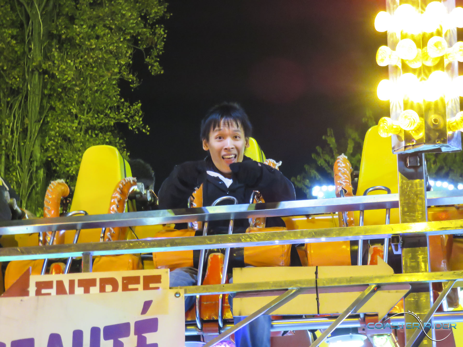Je me suis permis de tester la machine malgré tout ! Et franchement, ça passe pas trop mal ! Par ailleurs, ce métier se doit être testé deux fois : les places étant dos à dos, un côté vous attire à l'extérieur pendant la rotation pendant que l'autre vous écrasera au fond. Étant donné que j'ai testé à l'extérieur, j'ai subi de très fortes forces négatives assurant une intense éjection du siège. Sans sécurité, c'est le vol assuré !