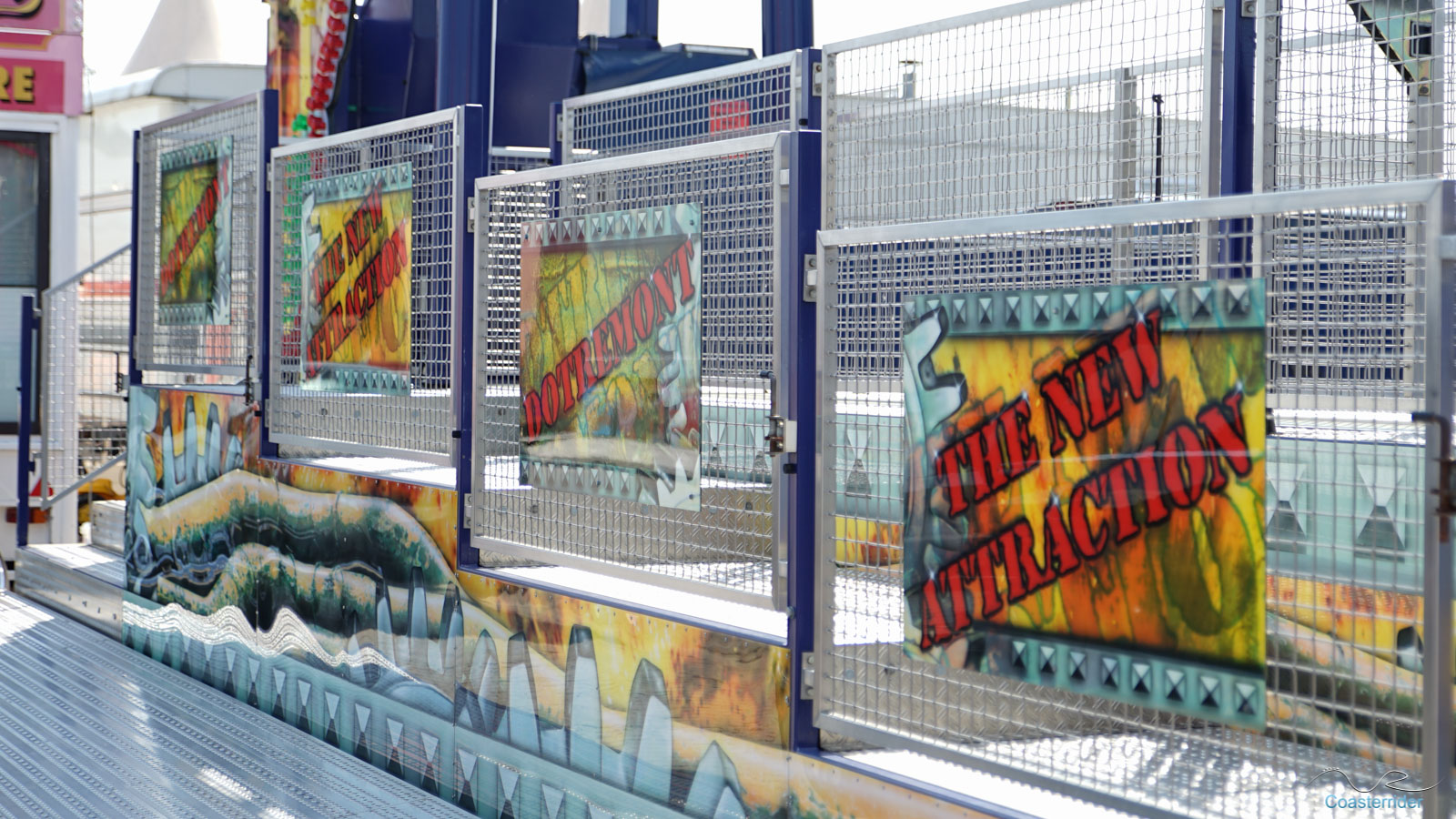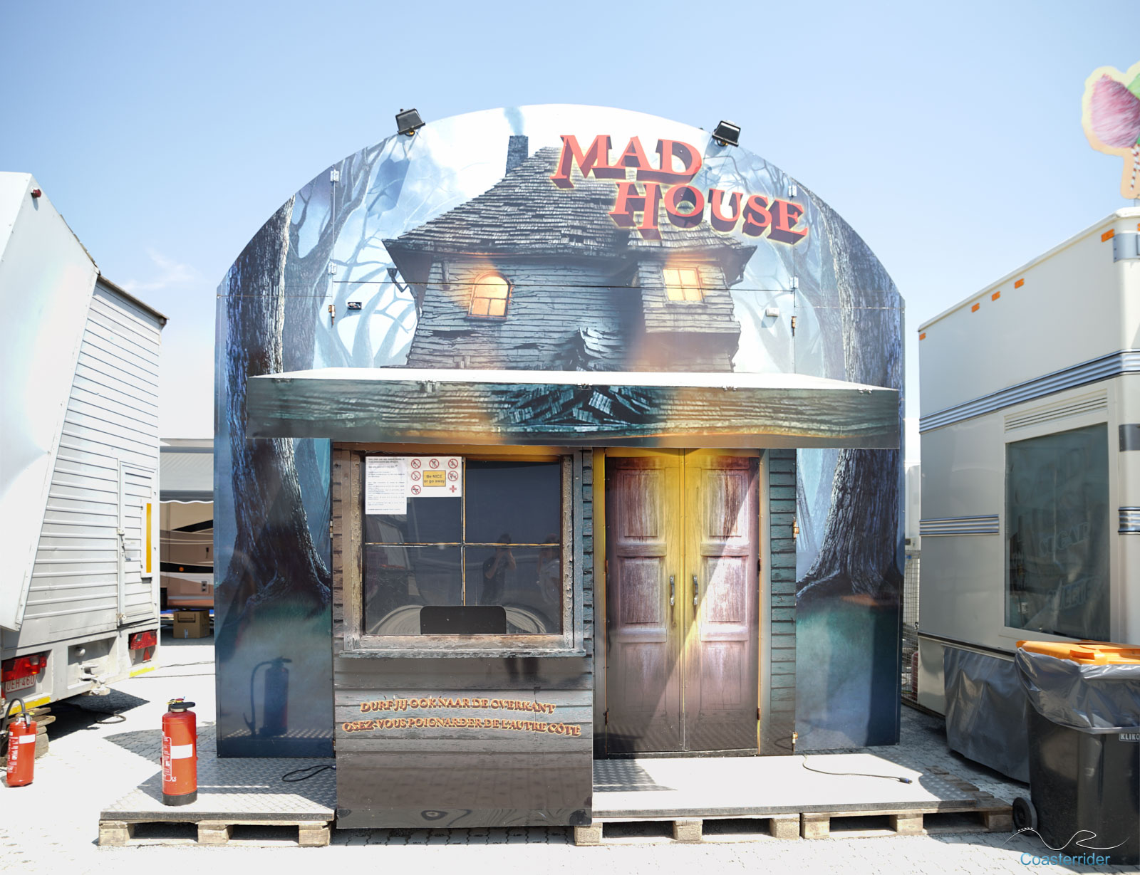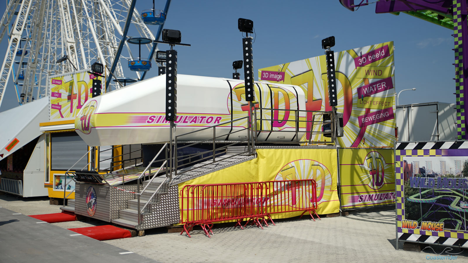 Je n'ai aucune idée si c'est Zamperla ou Cedeal Rides qui a conçu cette Wild Mouse, mais il s'agit en tout cas d'un modèle standard. L'enseigne par contre semble être de même technologie que celle de Bad Trip qu'il y avait à Cergy.Train fantôme/Spooktrein