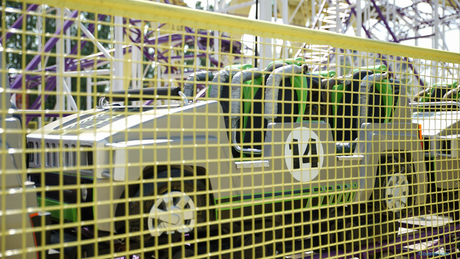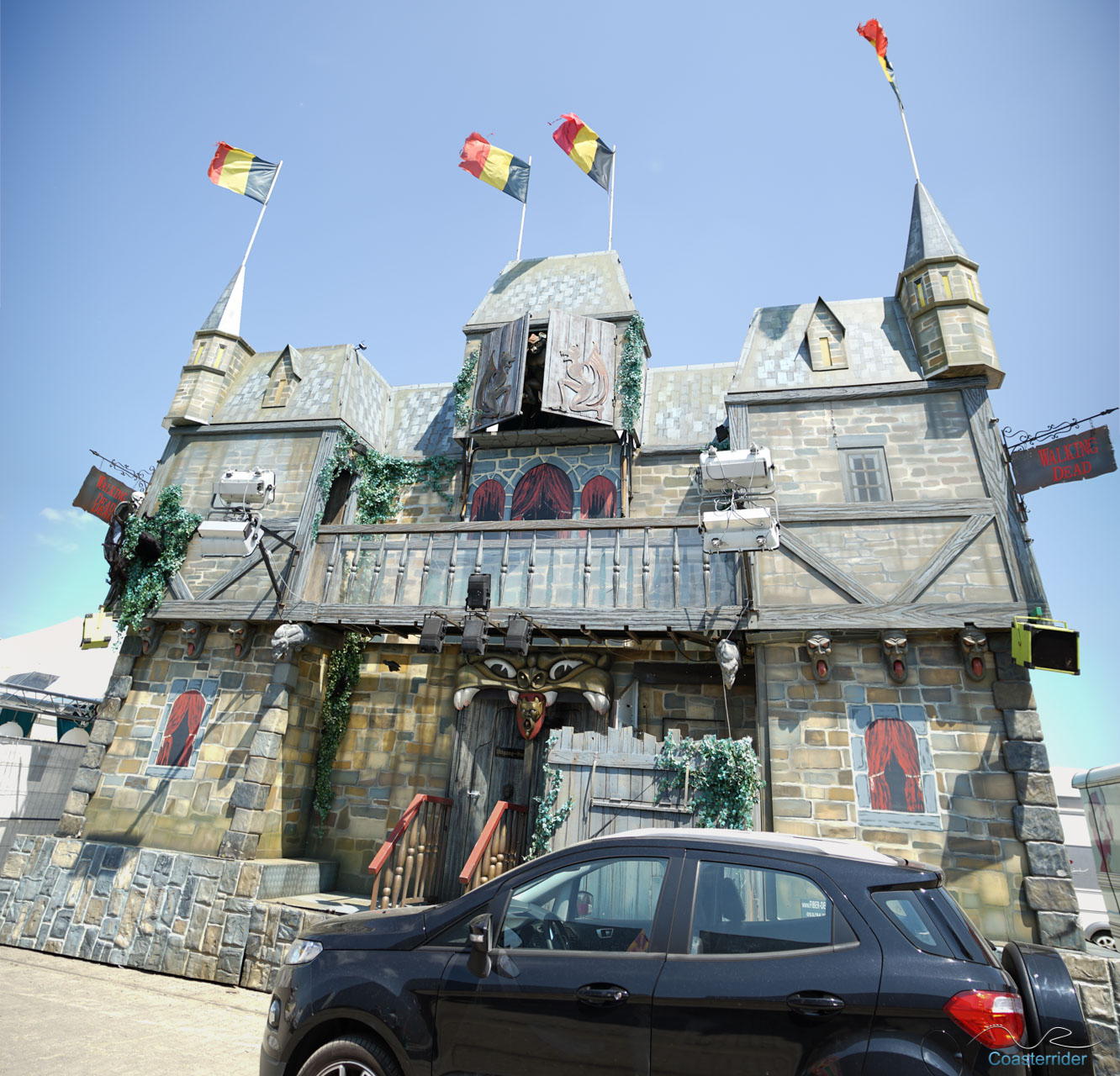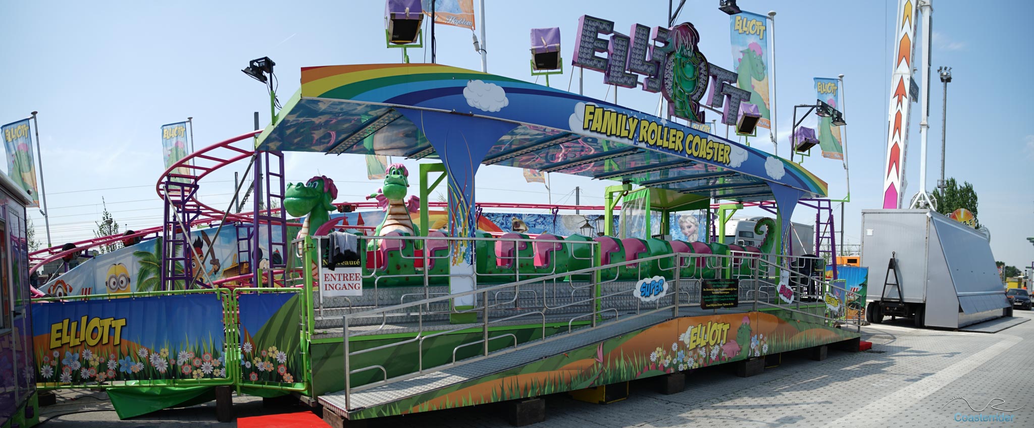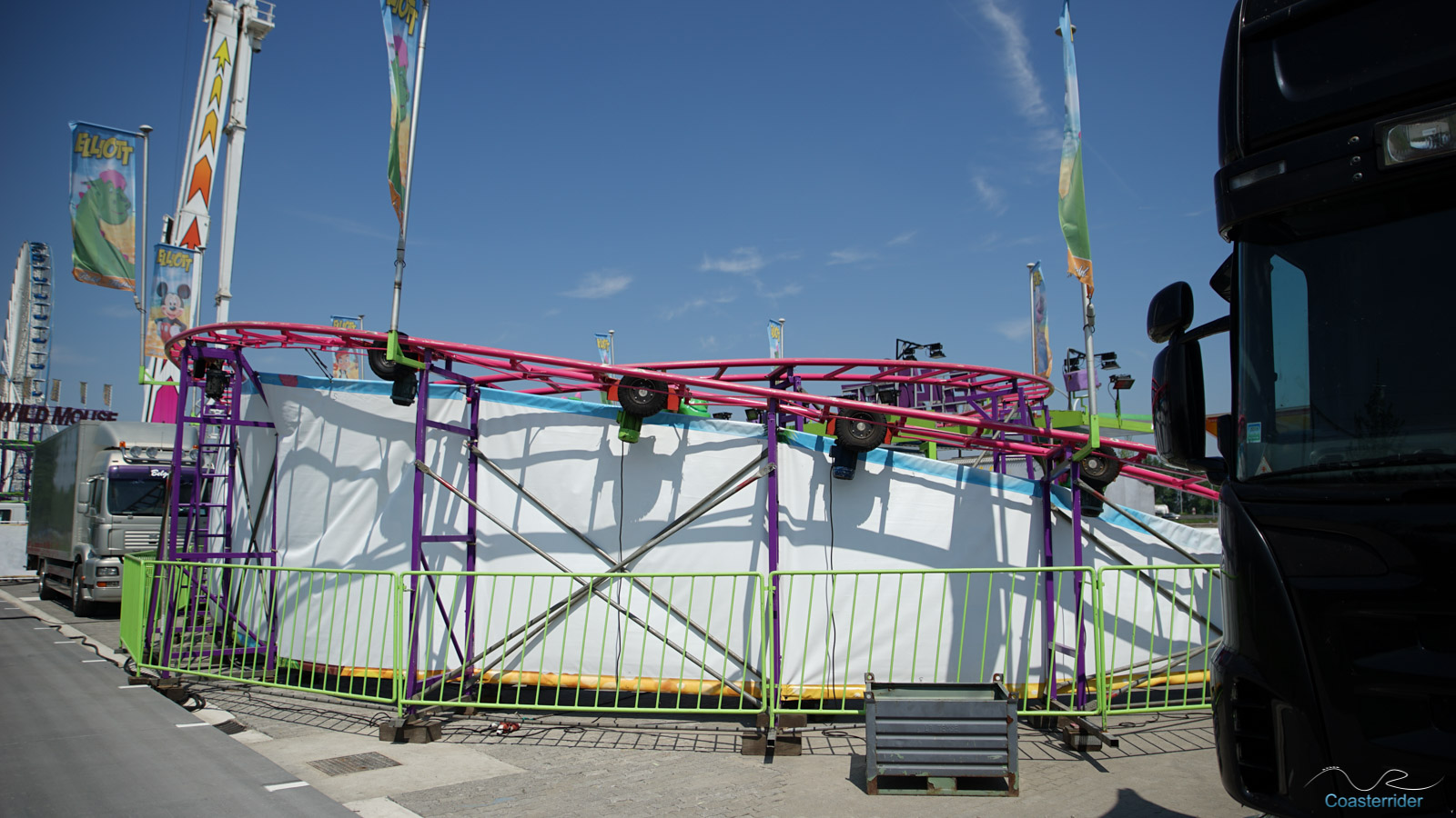 Je n'ai aucune idée si c'est Zamperla ou Cedeal Rides qui a conçu cette Wild Mouse, mais il s'agit en tout cas d'un modèle standard. L'enseigne par contre semble être de même technologie que celle de Bad Trip qu'il y avait à Cergy.Train fantôme/Spooktrein