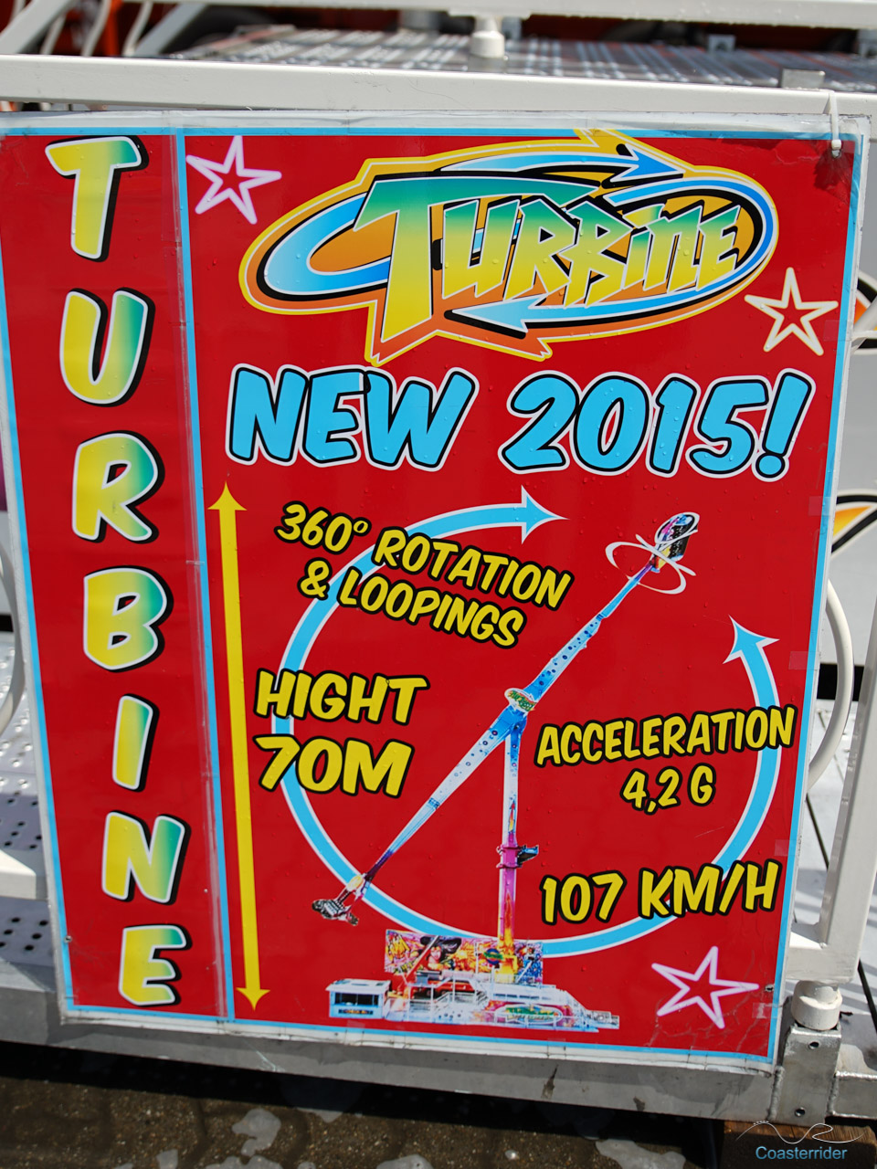 Le plus grand coaster du coin, qui rappelle l'Infernal Toboggan de Pinfari. Alors, vers la fin se trouve un bunny hop à la place de freins, ce qui me semble bien plus judicieux pour terminer le parcours. Mais autrement, ça fait Zyklon classique.Turbine