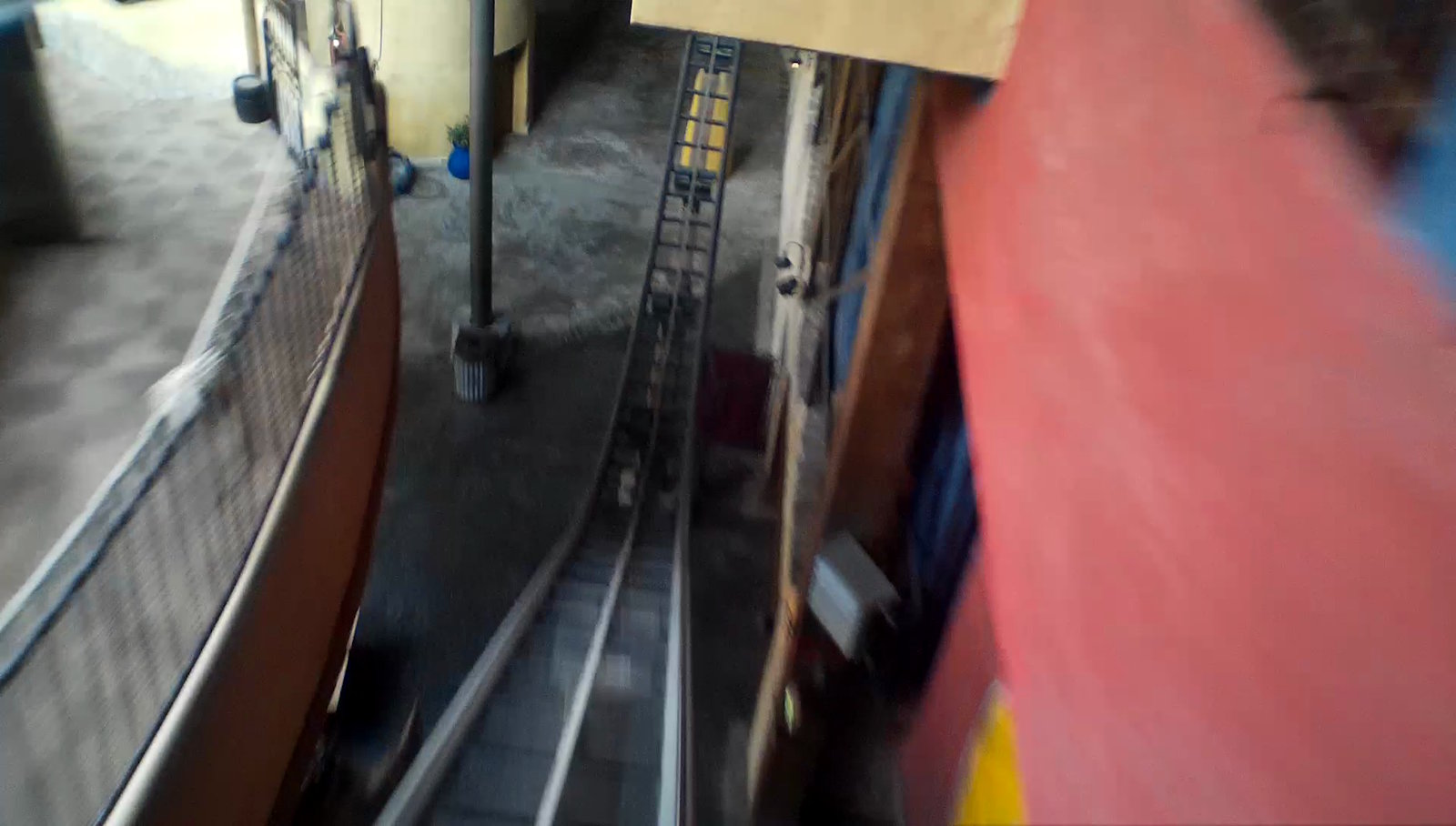 Entrée du virage après le second launch.C'était bien pour Flo' qu'on attendait à le faire en début de journée au risque de l'avoir en panne pour le reste de la journée. Il est vrai qu'en repassant plusieurs fois dans l'après-midi, on voyait souvent le coaster tourner à vide… Mais c'était un peu frustrant de voir qu'en milieu de journée, il n'y avait plus que 15 minutes d'attente contre les 105 affichées en sortant… Stratégie à adopter la prochaine fois.