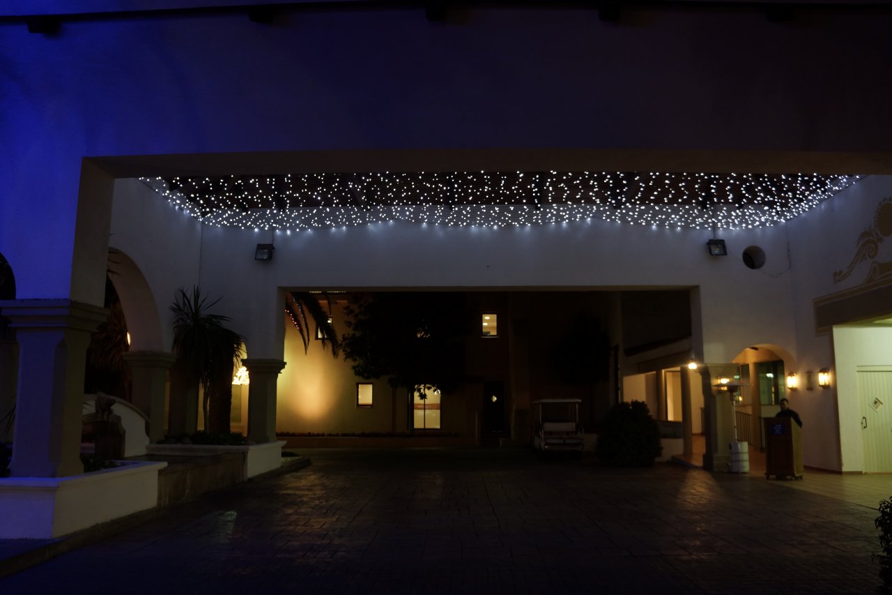 Points de vue nocturnes de l'hôtel différents. Le restaurant, c'est le bâtiment éclairé. 🙂 Là, j'étais dans la zone piscine/jacuzzi. Oui, l'eau était très froide. x)