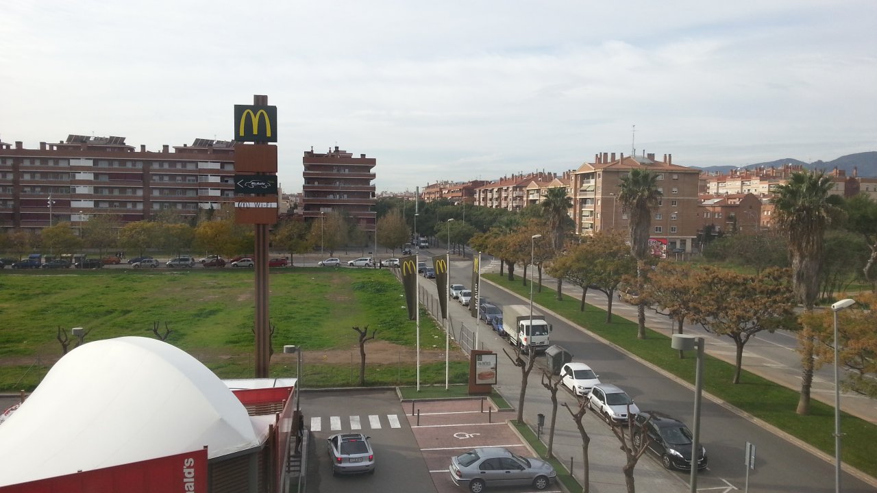 Viladecans de jour, depuis notre chambre, ce matin. 🙂 (Ah oui, ça pourrait être super pratique le McDo juste à côté ! 🙌)